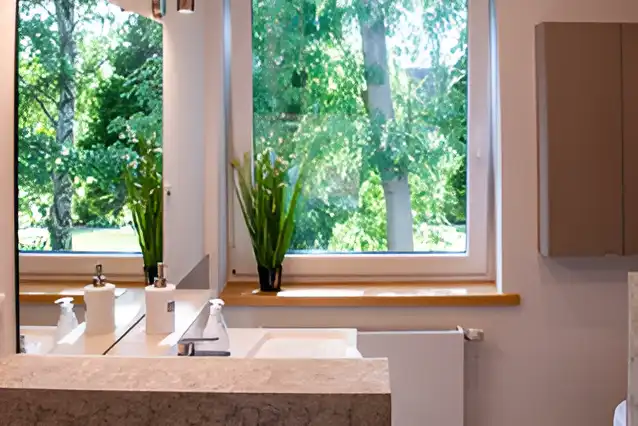 mit toller Aufteilung, Blick in sgrüne aus den grosszügigen Duschekabine